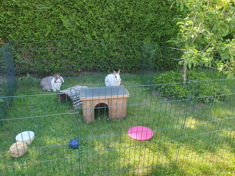 Het konijntje of de cavia krijgt hier elke week een schoon hok en in de zomer zelfs 2 × per week.