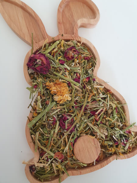 Bunny Sweets Wilde Bloemenweide is een mix luzerne, goudsbloem, kamille, rozenblaadjes en peterselie steeltjes