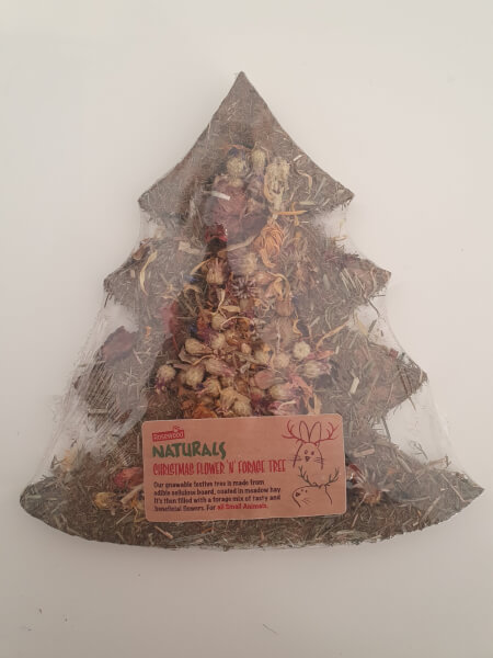 De Cupid & Comet Flower ‘N’ Forage Kerstboom 19 cm is een knaagspeeltje gemaakt van lagen eetbaar cellulosebord en bedekt met weidehooi. Deze kerstboom biedt jouw knaagdier een smakelijke uitdaging. Gevuld met een mix van heerlijke eetbare en nuttige bloemen, moedigt het aan tot knagen en foerageren, terwijl het verveling vermindert. Geliefd bij konijnen, cavia’s, chinchilla’s, degoes, hamsters, ratten, muizen en woestijnratten.