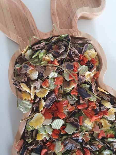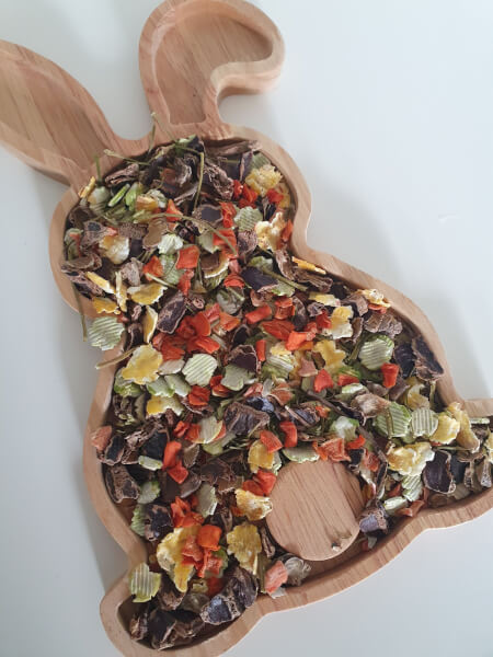 Onze eigen Bunny Sweets vlokkenmix van Wortelvlokken, Erwtenvlokken, Maisvlokken, Johannesbrood en Peterseliesteeltjes
