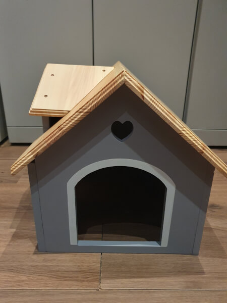 Dit Zweeds huis heeft twee openingen die breed genoeg zijn om eventueel twee konijnen te huisvesten. Schattige raamuitsparingen en de hartvorm in de gevel zorgen voor een gezellige sfeer. De basiskleur is lichtgrijs in plaats van blauwachtig (Pantone: 2162)